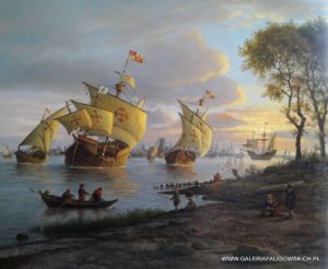 W 1492 roku, Krzysztof Kolumb wyruszył w podróż na czele trzech statków: Santa Maria, Pinta i Niña. 12 października tego samego roku, załoga wylądowała na wyspie Guanahani na Bahamach, odkrywając Nowy Świat. Obraz przedstawia moment, gdy Kolumb wypływa z Hiszpanii o wschodzie słońca.