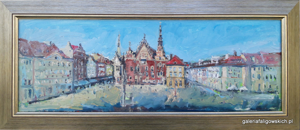 Obraz olejny na płycie/płótnie autorstwa Agaty Kaczuk-Jagielnik, wym. płyty 61 x 22 cm. (68 x 30 cm) „Wrocław wiosną”